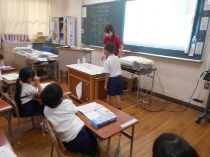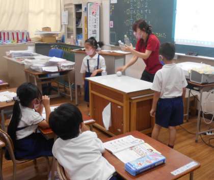 教科書(写真上)のように、ボウリングをして残った本数について、ひき算の式を立て計算して確認しました。一人ずつ全員投げさせてもらったようで、「わたし全部たおしてん!」「ぼく2本たおした〜」と嬉しそうに教えてくれました。
