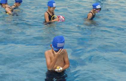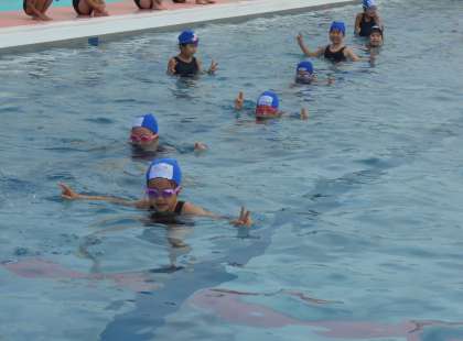 2年生 プール水泳では、水につかったり、浮いたりもぐったりの活動を、水遊びを取り入れながら取り組みました。まねっこ遊び(肩までつかってカニのポーズになって進みます。)・ヘディングレース(手を後ろにして頭でボールを進めます。)・もぐりっこ(水中にある輪や棒をもぐって拾います。)などをしました。楽しみながらもどんどん水慣れをしている様子でした。
