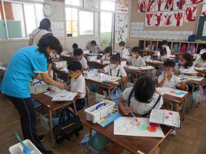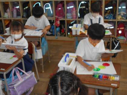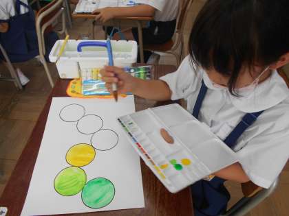 2年生は、初めての水彩絵の具の時間でした。絵の具の使い方をお勉強してから、「はらぺこあおむしを つくろう」と、3色の絵の具を選んで、色づくりをして描きました。パレットを片手に筆を持つ姿は、絵描きさんのようで格好良かったです。