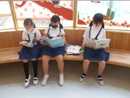 その談話コーナーを利用して、2階には「ぷちっと」というネーミングで書籍コーナーを設けています。写真は休み時間の2年生の様子です。「ぷちっと」のコーナーは、他のスペースでも少しずつ広げていければと考えております。
