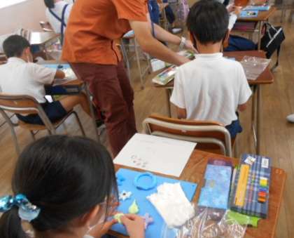 2年生図画工作科では「くっつきマスコット」の制作に取り組んでいます。今日は、紙粘土に水彩絵の具を練りこんで色付けし、そこから自分が考えたマスコットを一つ一つ作っていました。「これマカロンやねん」(写真上)と嬉しそうに見せてくれました。可愛い・楽しい・素敵なマスコットができそうです。