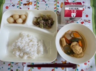 ★ごはん ★牛乳 ★一口がんもとさといものみそ煮 ★牛肉と野菜のいためもの ★みたらしだんご