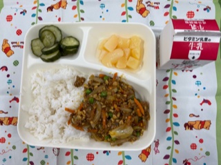 ★牛乳 ★大豆入りキーマカレーライス ★きゅうりのピクルス ★白桃