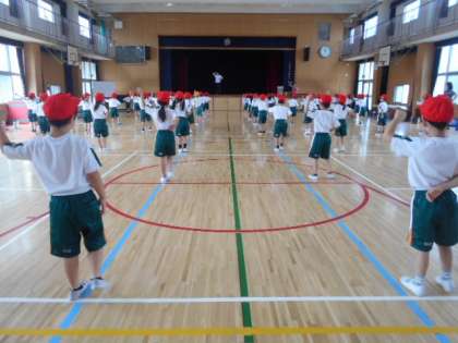 1年生 ダンスの練習風景です。「鬼滅の刃」の曲に合わせてのダンスです。先生のお手本を見てお話もよく聞いて頑張っていました。「水面切り!」があるそうです。