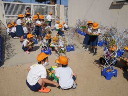 さて、写真は、1年生活科「アサガオのたねができたよ」の学習の様子です。夏にきれいな花を咲かせたアサガオですが、咲き終わった後の様子を観察しました。子どもたちの様子を見に行くと「たね。見つけたー!」と嬉しそうに報告に来てくれました。