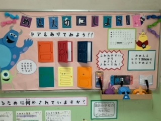 10月になり保健室横の掲示が変わりました。今回は、モンスターズインクの可愛らしいキャラが登場です。テーマは、「目を大切にしよう!」です。文字を書く時、ゲームをする時、スマートフォンを見る時など30cmの距離を取るように注意を呼び掛けています。ドアを開けると様々な生き物の視力や目の特徴についてわかる楽しいコーナーもあります。