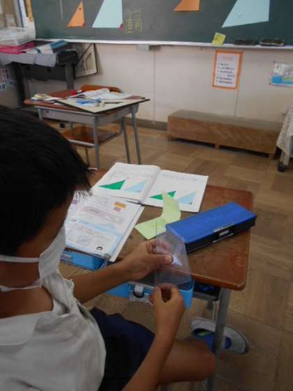 今日は、「切ってできた形について調べよう」ということで、直角について学習しました。三角定規にも直角があることや直角のある三角形を直角三角形ということを学びました。最後には、「2種類ある三角定規の辺と辺をつなぎ合わせると、四角形ができるよ。」と、三角定規を色々とつなぎ合わせて調べていました。(写真中・下段)