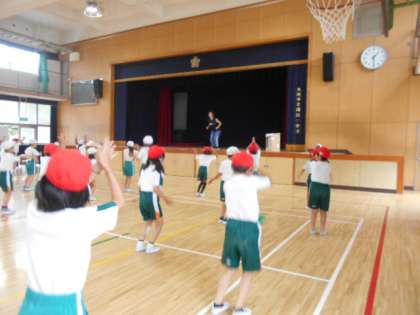 (写真上は放送してくれている代表委員会児童、写真下は、ダンスの練習3年生の様子です。)