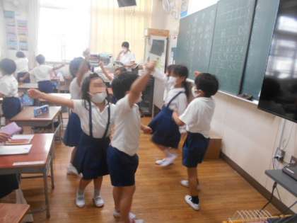 運動会当日は2学年ごとの実施なので、リハーサルでは本番で見ることができない学年のダンスを見ることになります。子どもたちには、他学年の「がんばり」「すごさ」「かわいらしさ」などを見てほしいと思っています。(写真は、ダンスの自主練をする一年生です。)