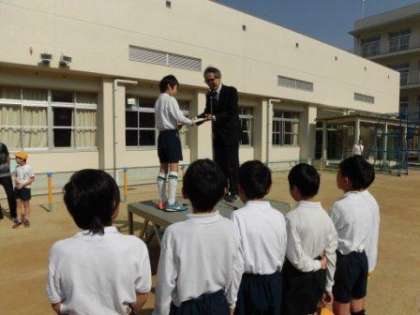 児童会の代表のあいさつや、サッカーの大正カップ新6年生大会優勝の表彰等がありました。