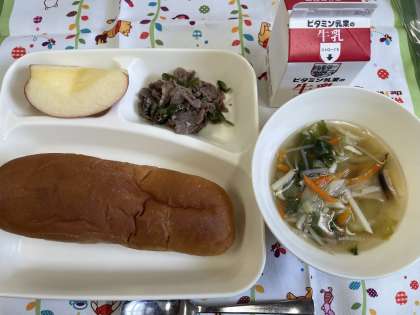 ★こくとうパン ★牛乳 ★牛肉のオイスターソース焼き ★中華スープ ★りんご