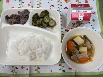 ★ごはん ★牛乳 ★くじらのたつたあげ ★豚肉とじゃがいもの煮もの ★きゅうりの赤じそあえ