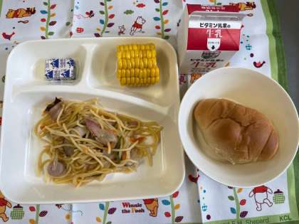 ★こくとうパン ★牛乳 ★ウインナーときのこの和風スパゲッティ ★焼きとうもろこし ★固形チーズ