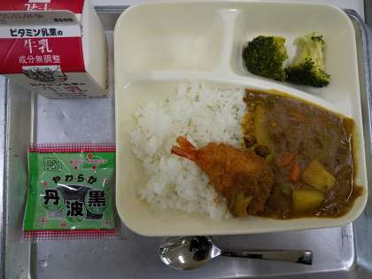 ★牛乳 ★えびフライカレーライス ★ブロッコリーのサラダ ★ソフト黒豆