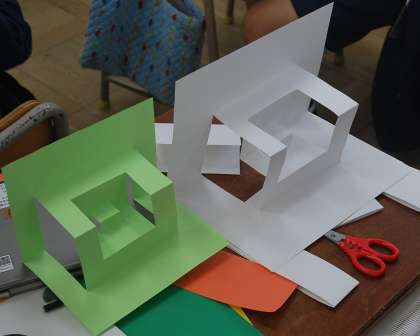 カードを開いて飛び出す仕組みをつくり、絵を描いたり、画用紙を貼ったりしていました。