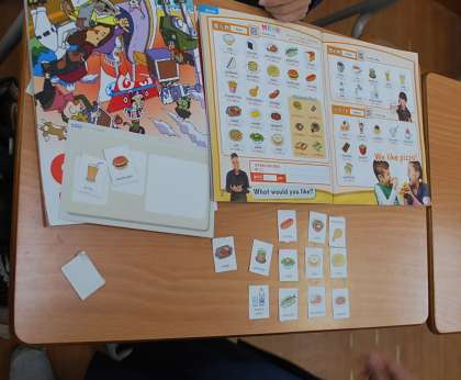 5年生の教室を訪れると、店員役と客役に分かれてカードに書かれている料理の注文と会計までを英語で言う活動をしていました。