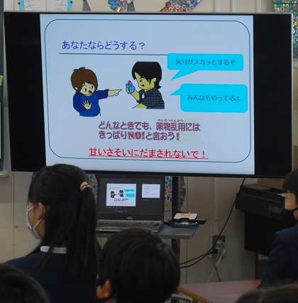 薬をお茶やジュースで飲むとどうなるのか、危険な薬物に誘われてしまったらなど、児童の安全や健康について実験などを交えながらお話しいただきました。