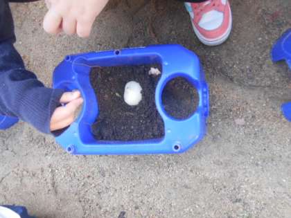 アサガオを育てていた植木鉢に、新しい土を入れチューリップの球根を植えました。植え替えの様子を見に行かせてもらうと、球根を嬉しそうに見せてくれました。綺麗なチューリップのお花が咲くといいですね。お世話をがんばってね。