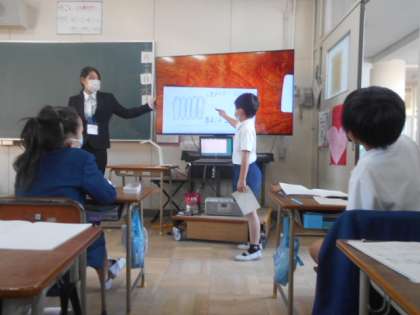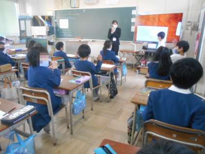2年生の算数は、「かけ算をつかって」の単元です。L字型に並んだボールの数を、工夫してかけ算をつかって求められないかを考えました。この日の授業は、先生方もたくさん見に来られていました。考えを発表する子、それを一生懸命聞く子どもたちの姿がとても良かったです。