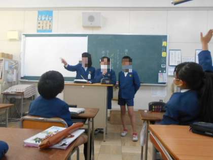 4年生の学級では、お楽しみ会の話し合いをしていました。お楽しみ会の時に、みんなで歌う歌を話し合っていました。「この曲ならみんな歌えるかなー」とか、「この曲は短すぎかなー」とか言い合いながら、司会の人たちを中心に雰囲気よく話し合っていました。