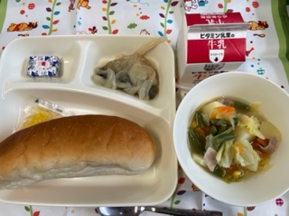 ★コッペパン・マーマレード ★牛乳 ★あじのレモンマリネ ★てぼ豆のスープ煮 ★固形チーズ