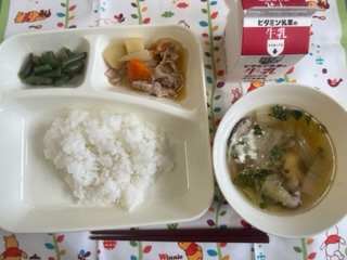 ★ごはん ★牛乳 ★変わり肉じゃが ★鶏肉と白菜のすまし汁 ★さんどまめのごまあえ