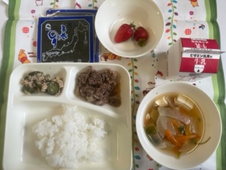 〜卒業祝い献立〜 ★手巻きごはん(牛肉の甘辛煮、ツナソテー) ★牛乳 ★すまし汁 ★いちご