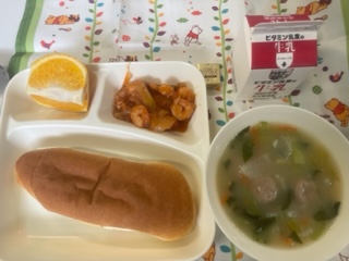 ★コッペパン、バター ★牛乳 ★えびのチリソースいため ★中華がゆ ★はっさく