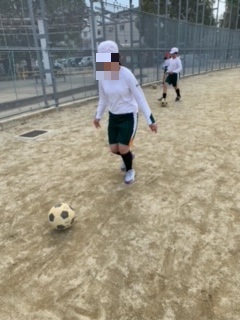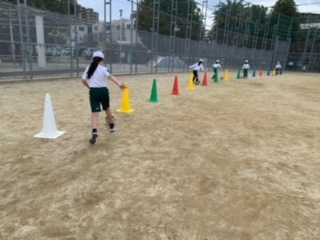 4年生の体育は、サッカーをしています。今日は、ゲームに向けてスキルを上げようとドリブルの練習に取り組んでいました。ジグザグドリブルは、なかなかコントロールが難しそうでしたが、たくさんのコーンの間をうまく通り抜けようとがんばっていました。