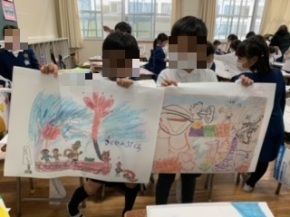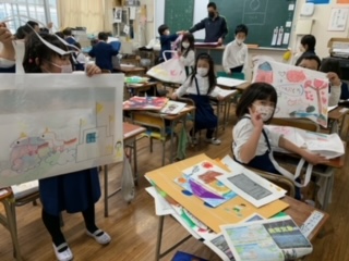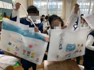 1年生の教室をのぞくと、今年作った作品を作品袋に入れて持ち帰る準備をしていました。(作品袋の絵が)「上手にかけているね〜。」と、一言声をかけると、次から次と(僕のも私のも)「見て見て〜。」「撮って撮って〜。」と作品袋の絵を見せに来てくれました。