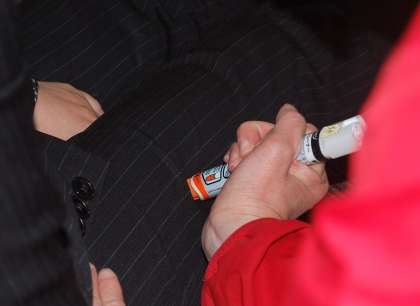 月曜日からの給食が始まります。食物アレルギーのある児童が、万一誤植した場合に備え、教職員の連携やエピペンの使い方などの研修を行いました。