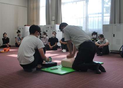 講師は本校教頭が務め、胸骨圧迫、AEDの使い方など、実習形式で行いました