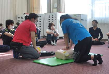 水の事故等で、万一の事態が起きた場合に備え、救命救急講習を行いました。