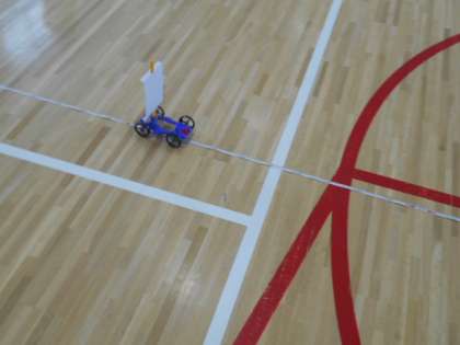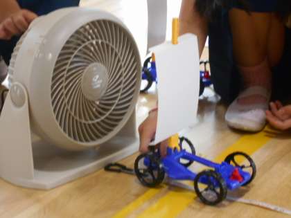 今日は、「風の強さを変えると、ものを動かすはたらきはどのようにかわるだろうか」というめあてで、自分たちが組み立てた帆がついた自動車で実験を行いました。