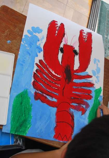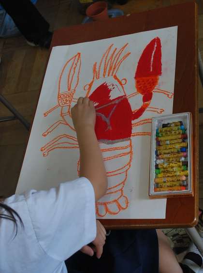 生活科で学習しているザリガニをよく見て、輪郭をとり、しっかりとパスで塗り込みます。