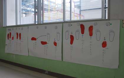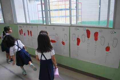 はぐくみネットの皆さんが、全学年の児童に河内音頭の足運びを教えるために、お作りいただいた掲示物をいきいき教室の前の廊下に掲示しています。