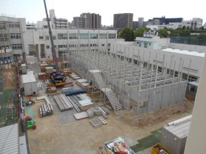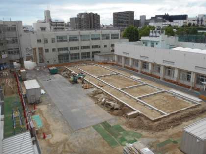 北校舎建て替えに伴い、これまで運動場に仮設校舎を設置して学習活動をしてきました。夏休み中に校舎内を片付け、2学期より、解体撤去作業が進められてきました。