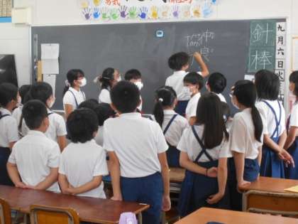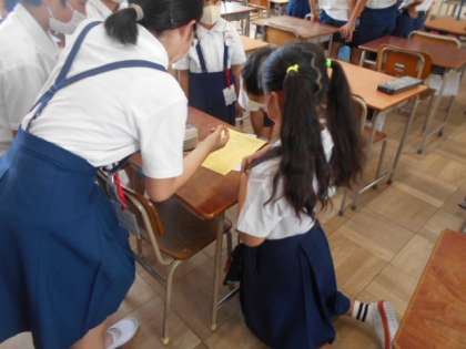 2時間目にキッズファミリー班(たて割り活動班)で集合し、ワイワイわんぱくランド当日に向けて「班のめあて」や「お店を回る順番の確認」をしました。