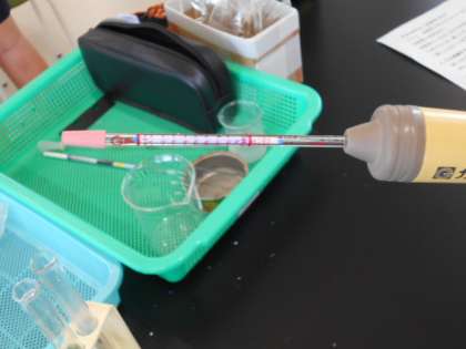 炭酸水から、試験管に気体を取り出し、石灰水や気体検知管、火のついた線香などを使って実験をしました。