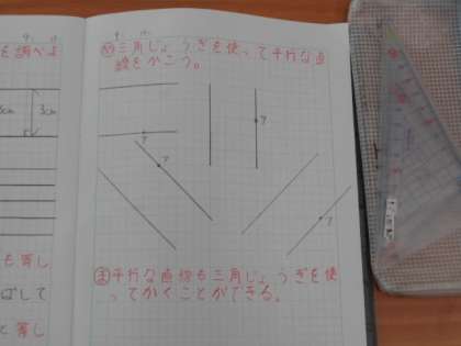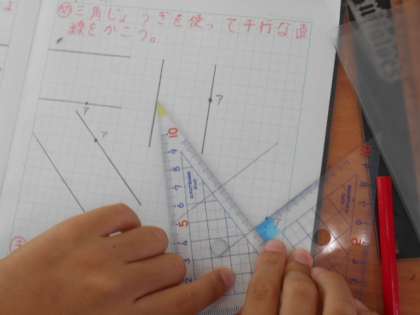 どうやったら三角定規を使って平行な直線をかくことができるかについて学習しました。