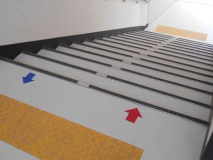 ろう下や階段には、右側を歩くように矢印マークがあります。