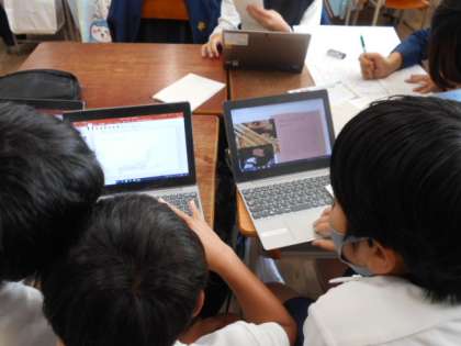パワーポイントにまとめたものは授業で発表し、他のクラスや学年の友だちにも見てもらえるようリーフレットにまとめたものを掲示していました。