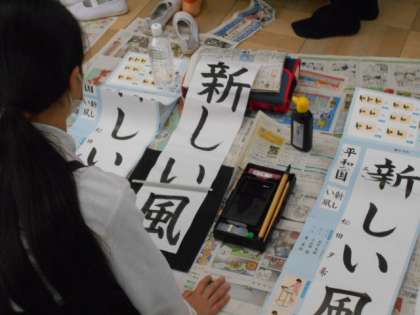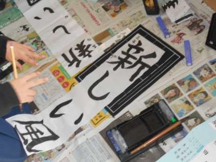机の上では、書くのが難しいので、特別教室も使って、床の上で書きました。