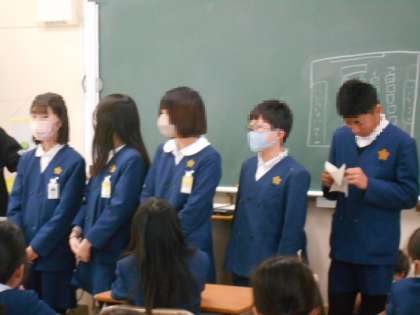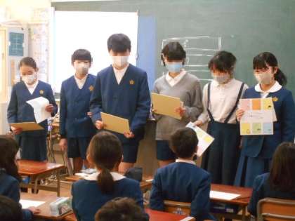 5年生を中心に、6年生一人一人にこれまでお世話になった感謝の気持ちを伝え、色紙を渡しました。
