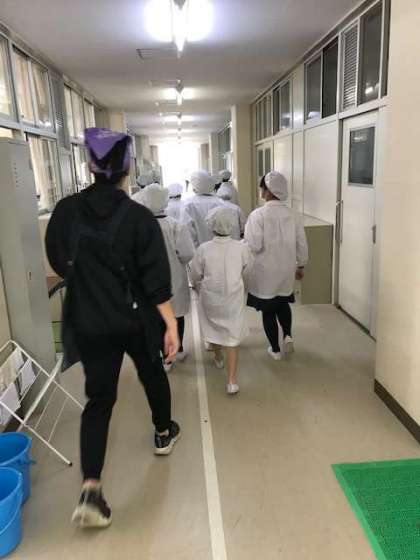 6年生の配膳の仕方を1年生は見て学んでいます。