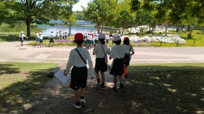 4〜5人の班ごとに、オリエンテーリングに出発して行きました。