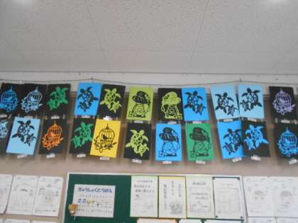 カッターで切り絵を仕上げました。細かなところまで丁寧に切り取ってあるので、背景の色画用紙と重ねることで、色鮮やかな作品に仕上がっています。