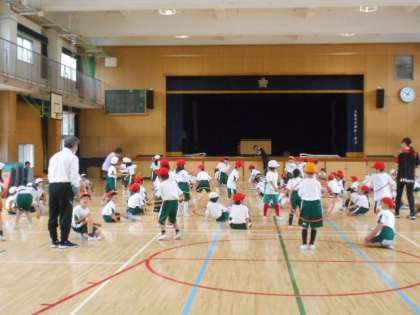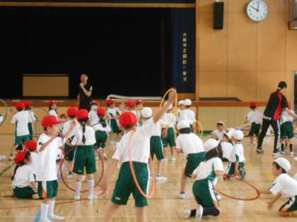フラフープを使って、身体つくりの運動をしています。腕で回したり、腰で回したり、みんなで手をつないで、フラフープをくぐってみたり。大きなフラフープを自由自在に操るのはなかなか難しかったようです。