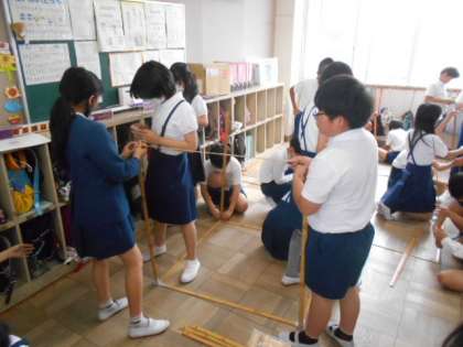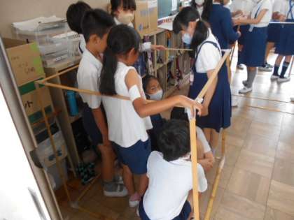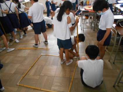 1平方メートルの立方体を作っているところです。1平方メートルの中に、何人入るのかを実物大の大きさで実験しています。立体の学習では理解を深めるために、実物を触ったり、作ったりしています。