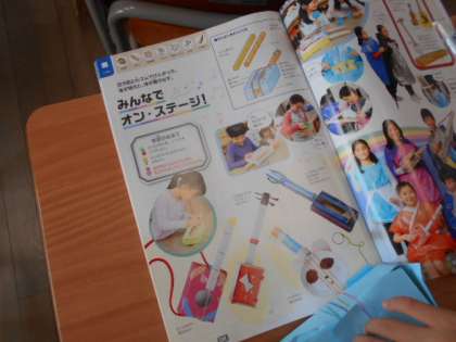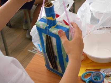 輪ゴムを使って、オリジナル楽器を作っています。どんな音色の楽器ができるかな。